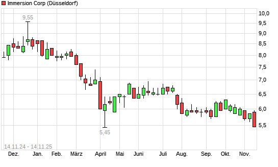Mit dem Rücksetzer auf 5,50 EUR hat die Immersion-Aktie (ISIN US4525211078) am 13.11.2025 ein neues 12-Monats-Tief erreicht und damit den Kurs vom 30.10.2025 eingestellt.