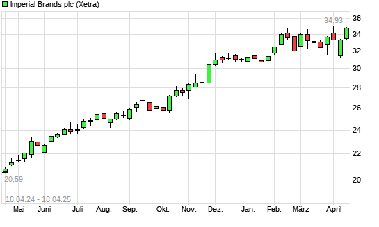 Mit dem Anstieg auf 34,77 EUR hat die Imperial Brands-Aktie (ISIN GB0004544929) am 17.04.2025 ein neues 5-Jahres-Hoch erreicht und damit den Kurs vom 12.02.2025 eingestellt.