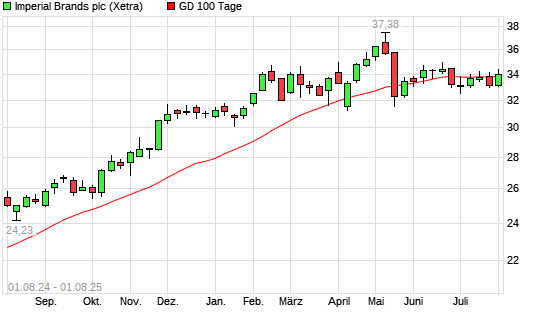 Mit dem Anstieg auf 34,47 EUR hat die Imperial Brands-Aktie am 31.07.2025 die 100-Tage-Linie nach oben gekreuzt.