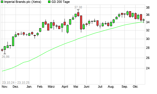 Mit dem Rücksetzer auf 33,83 EUR hat die Imperial Brands-Aktie am 22.10.2025 die 200-Tage-Linie nach unten gekreuzt.