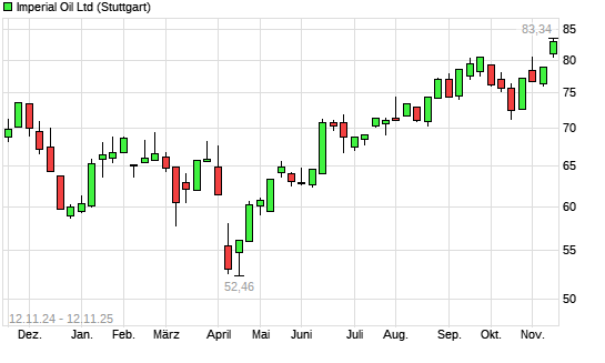 Mit dem Anstieg auf 82,36 EUR hat die Imperial Oil-Aktie (ISIN CA4530384086) am 11.11.2025 ein neues All-Time-High erreicht und damit den Kurs vom 10.11.2025 eingestellt.