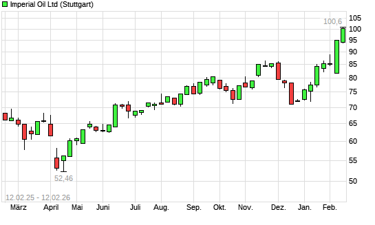 Mit dem Anstieg auf 95,70 EUR hat die Imperial Oil-Aktie (ISIN CA4530384086) am 11.02.2026 ein neues All-Time-High erreicht und damit den Kurs vom 10.02.2026 eingestellt.