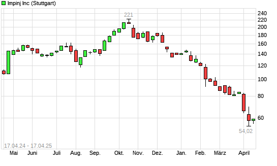 Mit dem Rücksetzer auf 55,38 EUR hat die Impinj-Aktie (ISIN US4532041096) am 16.04.2025 ein neues 12-Monats-Tief erreicht und damit den Kurs vom 09.04.2025 eingestellt.