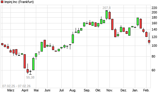 Mit dem Rücksetzer auf 107,35 EUR hat die Impinj-Aktie (ISIN US4532041096) am 06.02.2026 ein neues 6-Monats-Tief erreicht und damit den Kurs vom 02.02.2026 eingestellt.