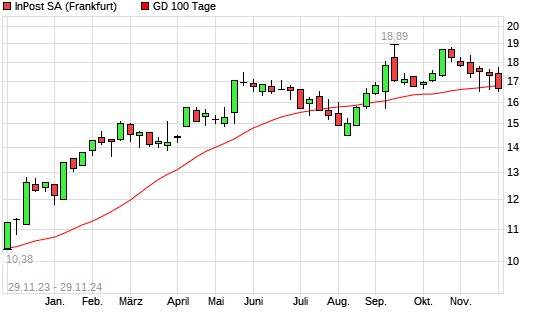Mit dem Rücksetzer auf 16,59 EUR hat die InPost-Aktie am 28.11.2024 die 100-Tage-Linie nach unten gekreuzt.