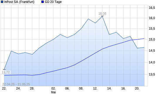 Mit dem Rücksetzer auf 14,61 EUR hat die InPost-Aktie am 20.05.2025 die 20-Tage-Linie nach unten gekreuzt.