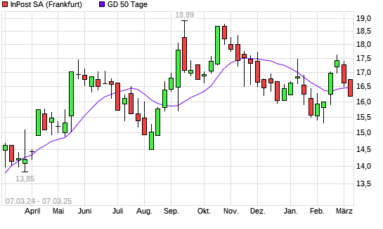 Mit dem Rücksetzer auf 16,42 EUR hat die InPost-Aktie am 06.03.2025 die 50-Tage-Linie nach unten gekreuzt.