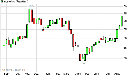 Mit dem Anstieg auf 73,54 EUR hat die Incyte-Aktie (ISIN US45337C1027) am 15.08.2025 ein neues 6-Monats-Hoch erreicht und damit den Kurs vom 14.08.2025 eingestellt.