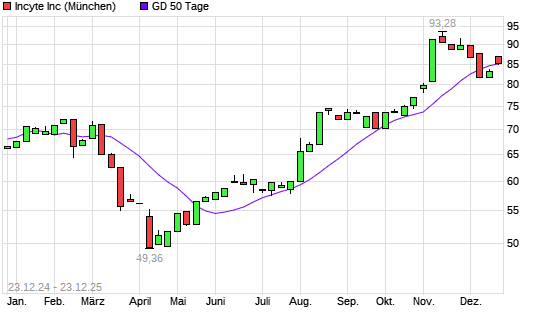 Mit dem Anstieg auf 86,98 EUR hat die Incyte-Aktie am 22.12.2025 die 50-Tage-Linie nach oben gekreuzt.Die Incyte-Aktie befindet sich seit dem 29.07.2025 im langfristigen Aufwärtstrend und hat ...weiterlesen