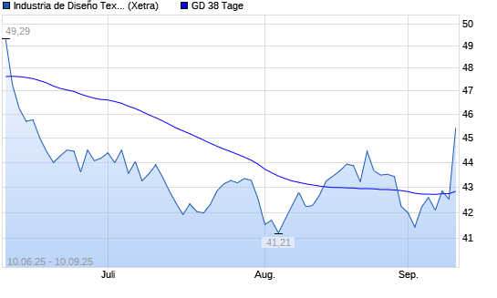 Mit dem Anstieg auf 42,66 EUR hat die Inditex-Aktie am 09.09.2025 die 38-Tage-Linie nach oben gekreuzt.