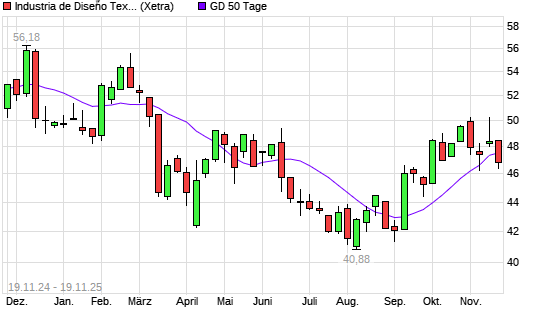 Mit dem Rücksetzer auf 46,42 EUR hat die Inditex-Aktie am 18.11.2025 die 50-Tage-Linie nach unten gekreuzt.