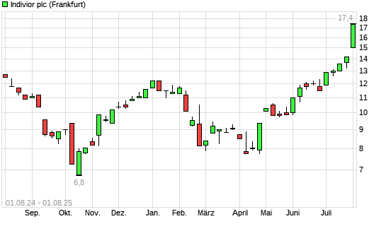Mit dem Anstieg auf 15,00 EUR hat die Indivior-Aktie (ISIN GB00BN4HT335) am 31.07.2025 ein neues 12-Monats-Hoch erreicht und damit den Kurs vom 30.07.2025 eingestellt.
