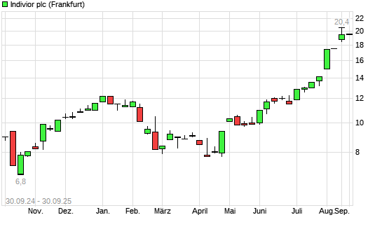 Mit dem Anstieg auf 19,60 EUR hat die Indivior-Aktie (ISIN GB00BN4HT335) am 29.09.2025 ein neues 12-Monats-Hoch erreicht und damit den Kurs vom 26.09.2025 eingestellt.