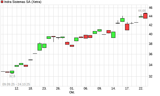 Mit dem Anstieg auf 44,80 EUR hat die Indra Sistemas-Aktie (ISIN ES0118594417) am 23.10.2025 ein neues All-Time-High erreicht und damit den Kurs vom 22.10.2025 eingestellt.
