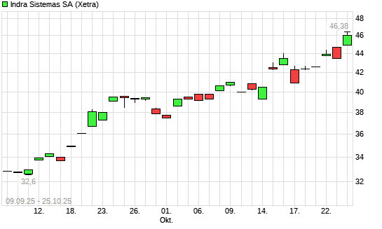 Mit dem Anstieg auf 46,12 EUR hat die Indra Sistemas-Aktie (ISIN ES0118594417) am 24.10.2025 ein neues All-Time-High erreicht und damit den Kurs vom 23.10.2025 eingestellt.