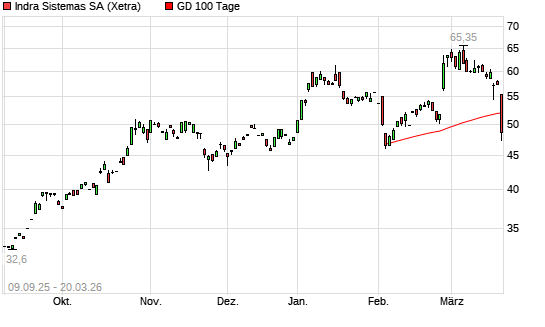 Mit dem Rücksetzer auf 47,42 EUR hat die Indra Sistemas-Aktie am 19.03.2026 die 100-Tage-Linie nach unten gekreuzt.