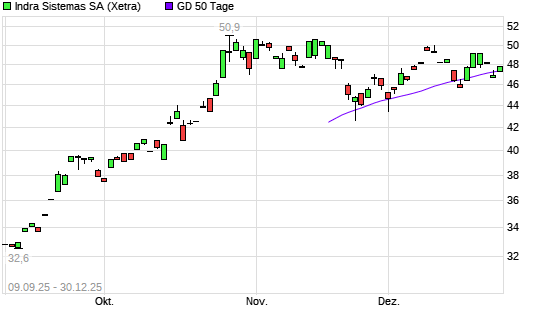 Mit dem Rücksetzer auf 47,36 EUR hat die Indra Sistemas-Aktie am 29.12.2025 die 50-Tage-Linie nach unten gekreuzt.