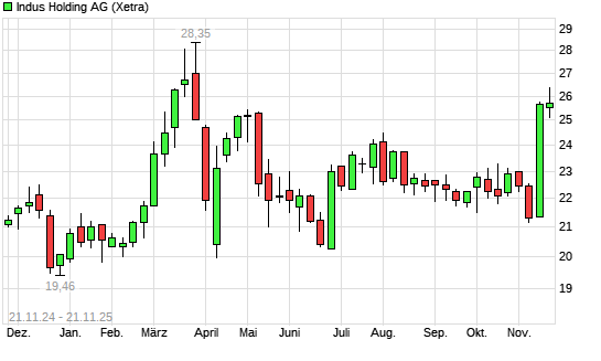 Mit dem Anstieg auf 26,00 EUR hat die Indus Holding-Aktie (ISIN DE0006200108) am 20.11.2025 ein neues 6-Monats-Hoch erreicht und damit den Kurs vom 17.11.2025 eingestellt.