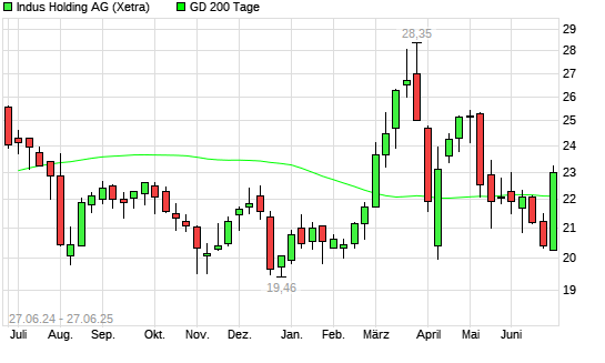 Mit dem Anstieg auf 22,65 EUR hat die Indus Holding-Aktie am 26.06.2025 die 200-Tage-Linie nach oben gekreuzt.