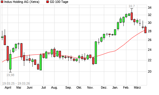 Mit dem Rücksetzer auf 27,60 EUR hat die Indus Holding-Aktie am 18.03.2026 die 100-Tage-Linie nach unten gekreuzt.
