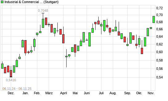 Mit dem Anstieg auf 0,70 EUR hat die Industrial & Commercial Bank of China-Aktie (ISIN CNE1000003G1) am 05.11.2025 ein neues 6-Monats-Hoch erreicht und damit den Kurs vom 11.06.2025 eingestellt.