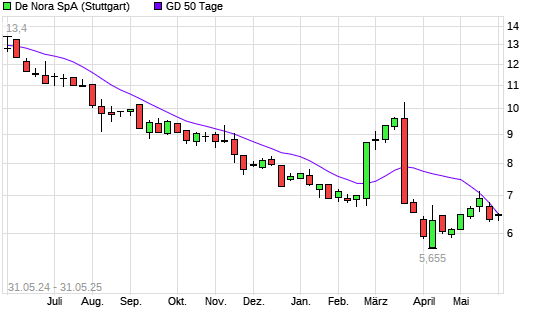 Mit dem Rücksetzer auf 6,40 EUR hat die Industrie De Nora-Aktie am 30.05.2025 die 50-Tage-Linie nach unten gekreuzt.