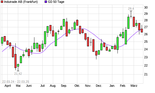 Mit dem Rücksetzer auf 26,28 EUR hat die Indutrade-Aktie am 21.03.2025 die 50-Tage-Linie nach unten gekreuzt.