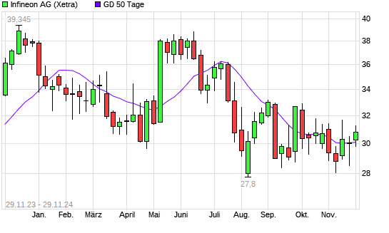 Mit dem Rücksetzer auf 30,00 EUR hat die Infineon-Aktie am 28.11.2024 die 50-Tage-Linie nach unten gekreuzt.