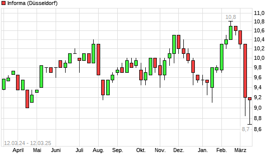 Mit dem Rücksetzer auf 8,90 EUR hat die Informa-Aktie (ISIN GB00BMJ6DW54) am 11.03.2025 ein neues 12-Monats-Tief erreicht und damit den Kurs vom 19.04.2024 eingestellt.