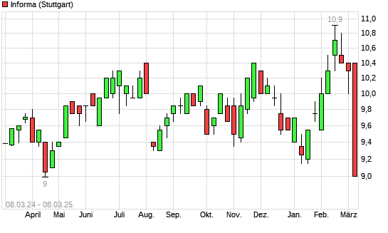 Mit dem Rücksetzer auf 9,30 EUR hat die Informa-Aktie (ISIN GB00BMJ6DW54) am 07.03.2025 ein neues 6-Monats-Tief erreicht und damit den Kurs vom 14.01.2025 eingestellt.
