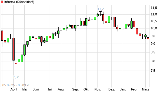 Mit dem Rücksetzer auf 8,95 EUR hat die Informa-Aktie (ISIN GB00BMJ6DW54) am 04.03.2026 ein neues 6-Monats-Tief erreicht und damit den Kurs vom 03.03.2026 eingestellt.