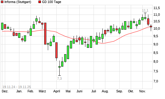 Mit dem Rücksetzer auf 10,30 EUR hat die Informa-Aktie am 18.11.2025 die 100-Tage-Linie nach unten gekreuzt.