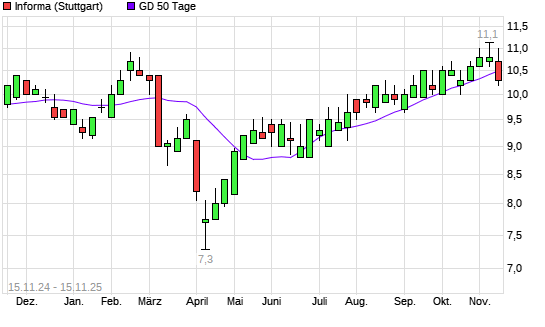 Mit dem Rücksetzer auf 10,60 EUR hat die Informa-Aktie am 14.11.2025 die 50-Tage-Linie nach unten gekreuzt.