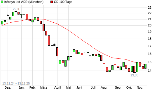 Mit dem Anstieg auf 14,70 EUR hat die Infosys ADR-Aktie am 12.11.2025 die 100-Tage-Linie nach oben gekreuzt.