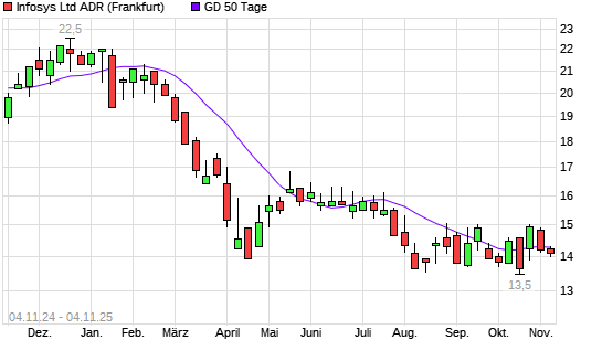 Mit dem Anstieg auf 14,30 EUR hat die Infosys ADR-Aktie am 03.11.2025 die 50-Tage-Linie nach oben gekreuzt.