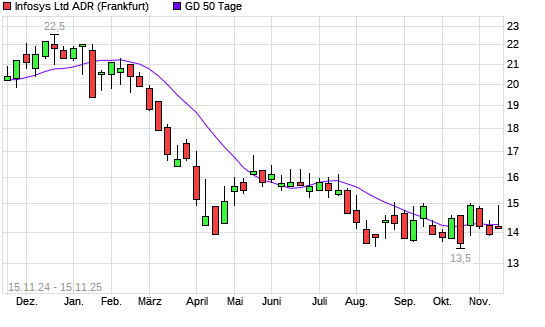 Mit dem Rücksetzer auf 14,15 EUR hat die Infosys ADR-Aktie am 14.11.2025 die 50-Tage-Linie nach unten gekreuzt.