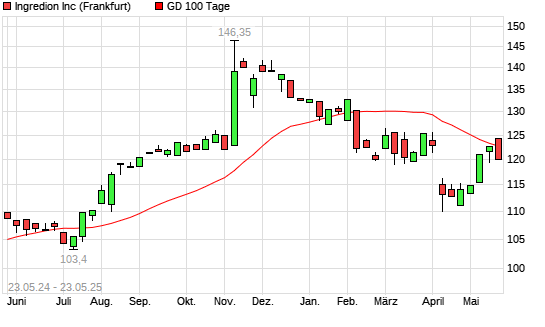 Mit dem Rücksetzer auf 120,90 EUR hat die Ingredion-Aktie am 22.05.2025 die 100-Tage-Linie nach unten gekreuzt.