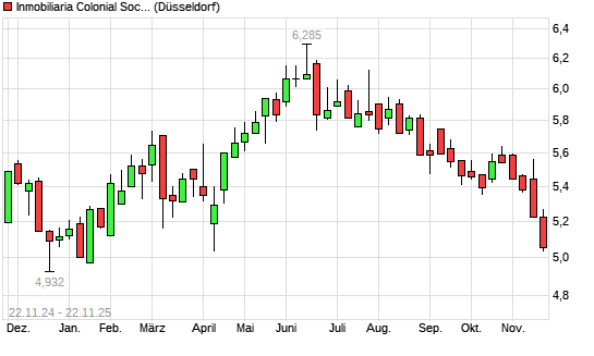 Mit dem Rücksetzer auf 5,05 EUR hat die Inmobiliaria Colonial-Aktie (ISIN ES0139140174) am 21.11.2025 ein neues 6-Monats-Tief erreicht und damit den Kurs vom 19.11.2025 eingestellt.