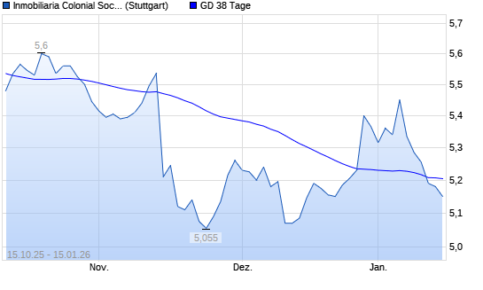 Mit dem Rücksetzer auf 5,17 EUR hat die Inmobiliaria Colonial-Aktie am 14.01.2026 die 38-Tage-Linie nach unten gekreuzt.Die Inmobiliaria Colonial-Aktie befindet sich seit dem 17.09.2025 ...weiterlesen