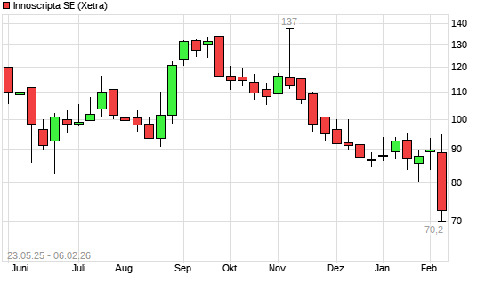 Mit dem Rücksetzer auf 74,50 EUR hat die Innoscripta-Aktie (ISIN DE000A40QVM8) am 05.02.2026 ein neues All-Time-Low erreicht und damit den Kurs vom 22.01.2026 eingestellt.