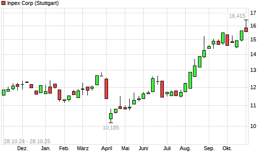 Mit dem Anstieg auf 16,05 EUR hat die Inpex-Aktie (ISIN JP3294460005) am 27.10.2025 ein neues 12-Monats-Hoch erreicht und damit den Kurs vom 24.10.2025 eingestellt.