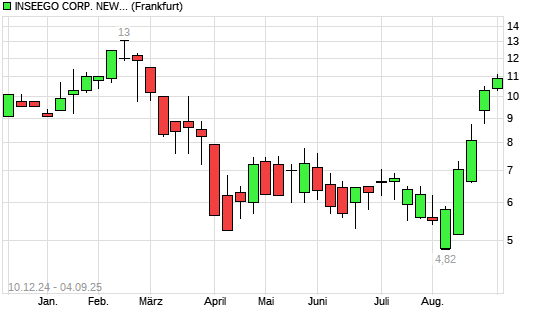Mit dem Anstieg auf 11,10 EUR hat die Inseego-Aktie (ISIN US45782B3024) am 03.09.2025 ein neues 6-Monats-Hoch erreicht und damit den Kurs vom 28.08.2025 eingestellt.