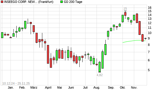 Mit dem Anstieg auf 8,80 EUR hat die Inseego-Aktie am 24.11.2025 die 200-Tage-Linie nach oben gekreuzt.