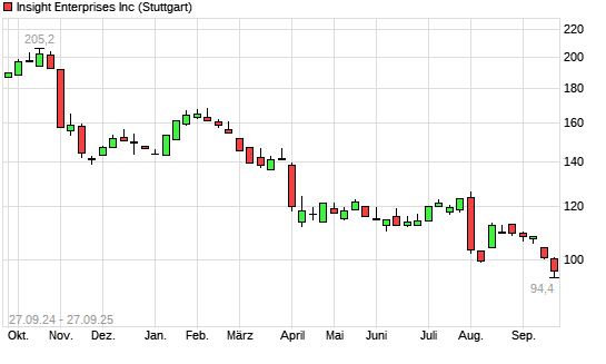 Mit dem Rücksetzer auf 94,78 EUR hat die Insight Enterprises-Aktie (ISIN US45765U1034) am 26.09.2025 ein neues 12-Monats-Tief erreicht und damit den Kurs vom 25.09.2025 eingestellt.