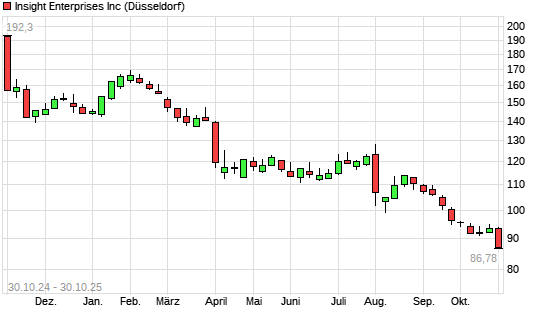 Mit dem Rücksetzer auf 89,66 EUR hat die Insight Enterprises-Aktie (ISIN US45765U1034) am 29.10.2025 ein neues 3-Jahres-Tief erreicht und damit den Kurs vom 20.12.2022 eingestellt.