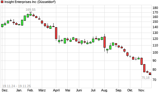 Mit dem Rücksetzer auf 75,40 EUR hat die Insight Enterprises-Aktie (ISIN US45765U1034) am 18.11.2025 ein neues 3-Jahres-Tief erreicht und damit den Kurs vom 14.11.2025 eingestellt.
