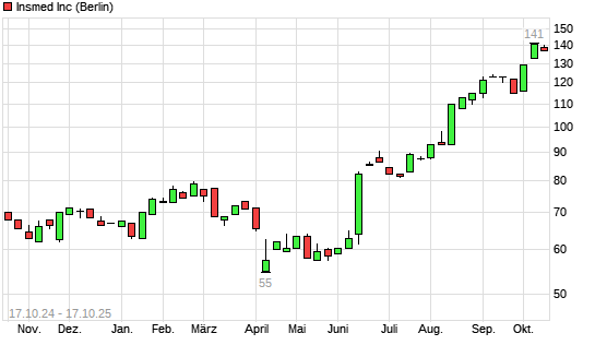 Mit dem Anstieg auf 142,00 EUR hat die Insmed-Aktie (ISIN US4576693075) am 16.10.2025 ein neues All-Time-High erreicht und damit den Kurs vom 10.10.2025 eingestellt.