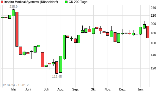 Mit dem Rücksetzer auf 168,80 EUR hat die Inspire Medical Systems-Aktie am 14.01.2025 die 200-Tage-Linie nach unten gekreuzt.
