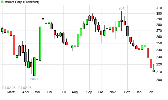 Mit dem Rücksetzer auf 212,00 EUR hat die Insulet Corp-Aktie (ISIN US45784P1012) am 03.02.2026 ein neues 12-Monats-Tief erreicht und damit den Kurs vom 29.01.2026 eingestellt.