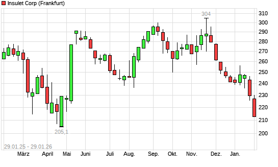 Mit dem Rücksetzer auf 215,50 EUR hat die Insulet Corp-Aktie (ISIN US45784P1012) am 28.01.2026 ein neues 6-Monats-Tief erreicht und damit den Kurs vom 27.01.2026 eingestellt.